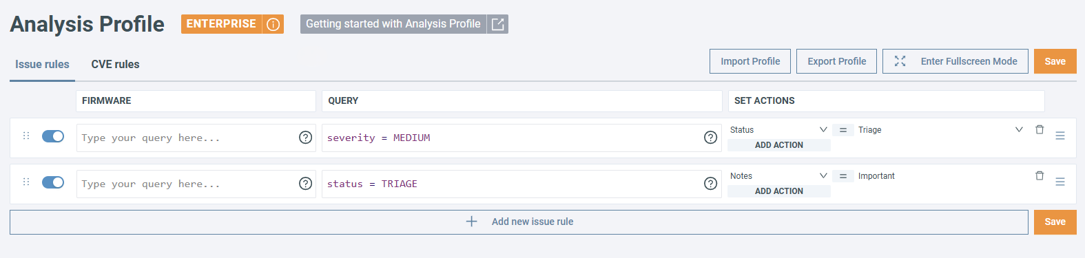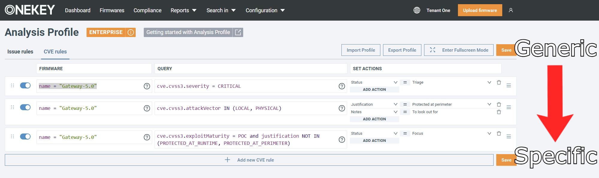 Use Analysis Profile to automatically evaluate vulnerabilities in your firmware analysis. Define rule-based logic using the ONEKEY Query Language (OQL) to automatically assign statuses, add comments, and perform vulnerability assessment. Drag and drop rules to change the order in which they run.